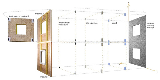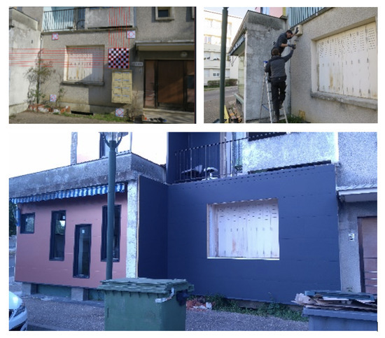 Regarding the potential marketability of the technology, it is important to remark that the results show that regulation such as DIN 18202 [37] was fulfilled. Moreover, the MK concept, its set of components and its process were implemented in a real building refurbishment (Figure 22). This was the first real case using MK without the assistance of the authors during the manufacturing and installation of the BERTIM project [22]. According to the data given by the company that manufactured and installed the prefabricated module with the MK, the cost of this process was about EUR 200 per square meter. The cost of conventional methods such as ETICS and rain-screen is less, around EUR 90 to 150 per square meter [6], depeding on the country. The cost of the improved version of the MK could be reduced by improving some points:
