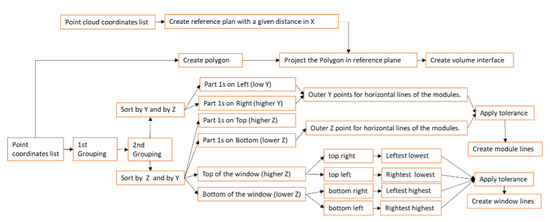 It is important to focus on one of the steps in Phase 3, which is a data processing and automated layout and MK interface definition. These data need to be processed to automatically create the layout of the modules. A new flowchart was created which includes the data from the Point Cloud (Figure 13) and creates the shape of the interfaces with developed Python™ nodes within Dynamo™.