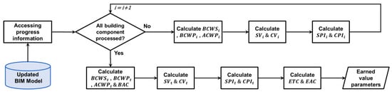 76]. The earned value analysis provides additional progress indicators that act as an early warning of performance problems. Integrating this analysis into the current method can facilitate the reporting stage. The updated BIM model contains both cost and schedule information, which is stored in the appropriate work breakdown structure in the BIM model being linked through the IFC schema. This presence of information entities in this standardized form enables the computation of earned value indicators such as variances (cost/schedule, variance at completion), performance indices (cost/schedule performance index), and forecasts (estimate at completion, estimate to completion). The proposed method also performs the earned value analysis of individual building components to analyze each component for comprehensive project tracking. The approach to performing the earned value analysis is illustrated in