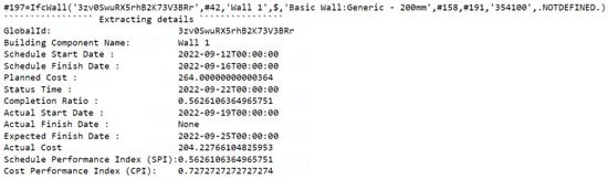 Figure 12 shows the progress information related to that building component (#197), retrieved from the BIM model, which is reported in the Python environment. The estimated actual progress parameters, related to time, cost, and other additional information in the form of an expected finish date, corresponding to the approximately 56% completion of the component, are also presented. Although the actual costs were relatively high, the estimated actual cost for the component (#197) is lower, mainly due to the fact that the component is more than half built. Furthermore, the earned value indicators are also estimated to individually analyze each component for improved project tracking. The performance indices of the component (#197) are less than 1 for both schedule and cost, highlighting how much the component is behind/over the planned schedule/cost.