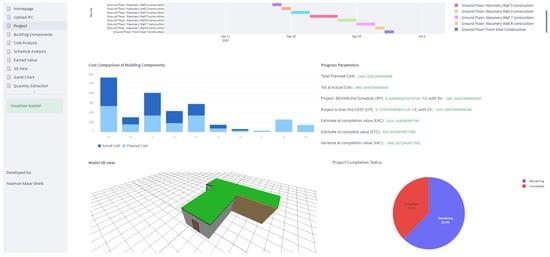 Figure 15, displaying the project-level progress details of the updated BIM model in the form of charts, graphs, and 3D visualization. The developed application makes use of different progress parameters present within the standardized hierarchy of IFC-based BIM to facilitate reporting. It is pertinent to mention here that the proposed method does not store the individually earned parameter values, mainly to ensure a possible reduction of the IFC file size. The parameters are computed in real-time based on the already-stored schedule and cost parameters; however, they can be stored in a separate property set if required.