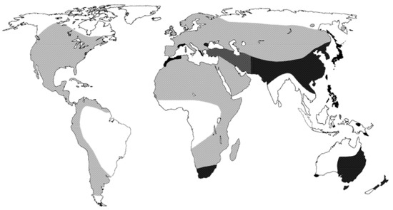 Map of Phragmites distribution worldwide (The shaded areasindicates the areas where PG is located) [8].