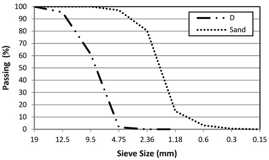 Coarse aggregate (C.A.): In this study, the coarse aggregate used was a crushed dolomite (D) with a specific gravity of 2.61. The coarse aggregate satisfies the same requirement that was satisfied by the fine aggregates [52,53,54]. The maximum nominal size was 12.5 mm. The grain size distribution curve for the used coarse aggregates is shown in Figure 2.