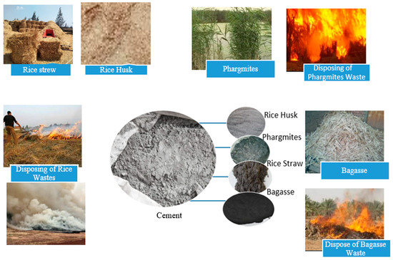 Rice ranks as the world’s second-largest cereal crop, following wheat, and generates significant amounts of crop residue. Consequently, researchers have explored using rice waste, specifically rice straw and rice husk, to create ash for the concrete industry. Rice straw refers to the dried stalks of rice plants after grain and chaff removal, while rice husk is a natural sheath encompassing rice grains that lacks commercial value when removed during refinement [2,3,17,18,19,20,21,22,23,24,25,26,27,28].