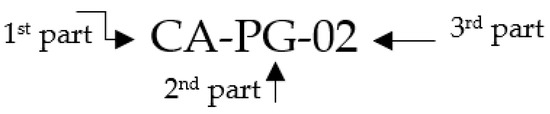 The tested mixes’ nomenclatures are shown in Figure 4. The first part refers to the existence of the curing agent, where (WC) indicates that no curing agent is used and (CA) indicates samples contain curing agent. The second part indicates the type of the used natural ashes ((PG) for Phragmites ash, (RS) for Rice Straw ash, (RH) for Rice Husk ash, and (BG) for Sugarcane Bagasse ash). The third part indicates the replacement ratio of the OPC with the natural ash (01 for (1%), 03 for (3%), 05 for (5%), 10 for (10%), and 15 for (15%)).