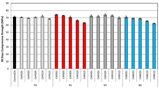 With regard to the effects of using the distinct natural ash types shown in Table 5 and Figure 5, it is apparent that incorporating PG ash at replacement ratios of 1, 3, 5, 10, and 15% resulted in a change in compressive strength in 28 days of 0.8, −2.6, −1.1, 1.0, and −4.0% as a percentage of the control CA mix compressive strength at 28 days, respectively. As for RS ash, replacing OPC with 1, 3, 5, 10, and 15% RS ash caused a change in compressive strength in 28 days by about 4.3, 2.5, −0.8, −7.0, and −11.50%, respectively.
