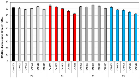 For RH ashes, there was a change of approximately 1.5, 0.7, 3.7, 2.2, and −2.1% in the 28 days compressive strength for samples containing 1, 3, 5, 10, and 15% of RH ash as a replacement of OPC than that of the control CA mix. Lastly, there was a decrease in the 28 days compressive strength compared to that of the control CA mix when using BG ash by about 0.6, 2.9, 3.4, 8.0, and 12.7 for 1, 3, 5, 10, and 15% of BG ash as a replacement of OPC, respectively. Consequently, it can be concluded that using RH ash followed by PG ash proved most effective as a replacement of OPC in the range from 1 to 15% when compared to RS and BG ash. Additionally, by tracking the compressive strength results at subsequent ages until the age of 365 days that shown in Table 5 and comparing Figure 5 with Figure 6, it could be found that the improvement of the compressive strength over age for RH, PG, and RS ash was better than that in the case of using BG sh.