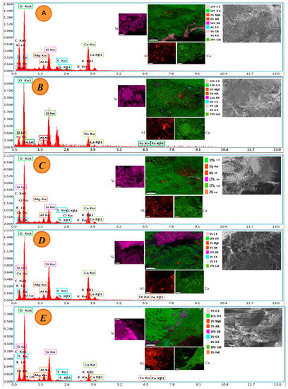 EDX and SEM analysis for HSSCSCC mixes (A) Control CA (B) CAPG10 (C) CARS10 (D) CARH10 (E) CABG10.