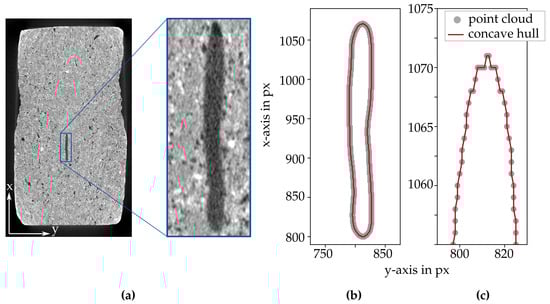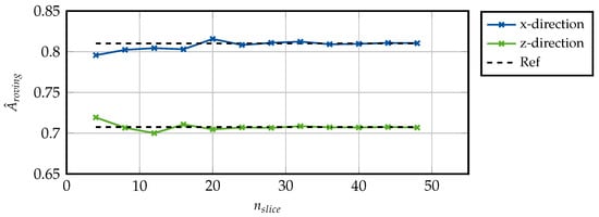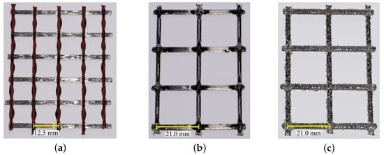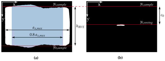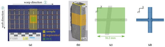 - Orthogonality: From Figure 2c, it is clear that the rovings in warp and weft directions were not perfectly orthogonal to each other. However, the rotation of the extracted roving led to only small deviations in the derived geometric properties. Additionally, the distortion was introduced by the extrusion process. Using classical production methods, the distortion of the textile is less distinct. Thus, the assumption of orthogonal rovings is valid.