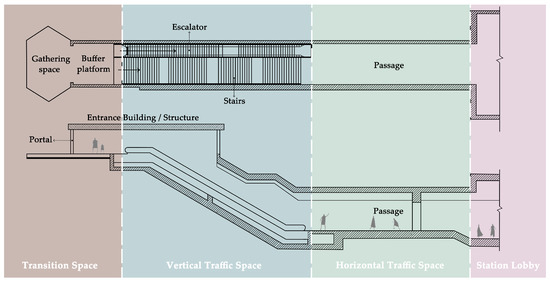 The architecture of a typical subway entrance is divided into three main areas: the transition space, vertical traffic space, and horizontal traffic space, as depicted in Figure 1. The entrance sequence initiates at the portal, delineating the boundary between the cityscape and the subway environment. Contiguous to the portal lies the entrance edifice, encompassing stairways and escalators that transport passengers across different planes. The buffer platform operates as a transient zone that modulates passenger flow and mitigates bottlenecks. Leading from this is the gathering space, a capacious area designed to accommodate commuters during ingress or while congregating with others. The vertical traffic space is dedicated to the vertical transit of passengers, utilizing stairs and escalators, whereas the horizontal traffic space is aligned with the ground level, providing thoroughfares to the station lobby. The station lobby serves as a central nexus, connecting various passages and facilitating entry to train platforms.