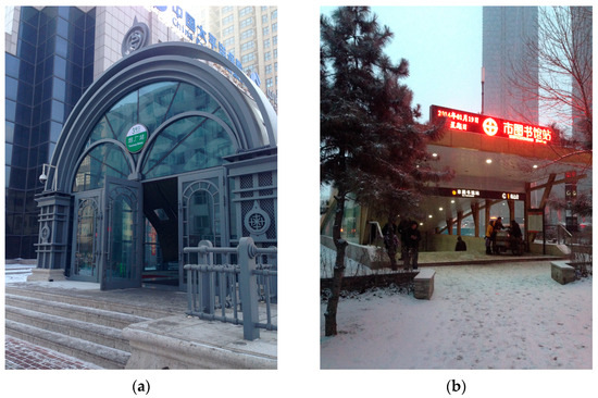 Data for the research were gathered via self-administered surveys carried out in Harbin and Shenyang between December 2022 and January 2023. Harbin and Shenyang, major cities in Northeast China and the respective capitals of Heilongjiang and Liaoning provinces, both are situated above the 41-degree-north latitude mark. These cities are characterized by their distinct seasons, with long winters and short summers, defining them as typical cities in a cold climate zone. Harbin, often referred to as the Ice City, experiences a more severe cold climate compared to Shenyang. This difference in the extremity of the cold climate is reflected in the design of subway entrances and exits in Harbin and Shenyang. As evidenced in Figure 2, subway access points in Harbin are fully enclosed, in contrast to Shenyang’s predominantly semi-enclosed subway entrances and exits. This variance in enclosure levels between the two winter cities suggests potential differences in planning and architectural design strategies for subway entrances. Therefore, Harbin and Shenyang have been chosen as the study areas for this research.