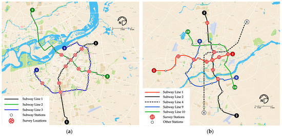 To ensure a randomized sample, six trained postgraduate students from our research team were deployed across different types of subway stations, as detailed in Figure 3. The legends denote surveyed stations with red subway icons in each city. Out of 500 leaflets distributed, 407 subway riders participated, yielding 388 valid responses, including 202 from Harbin and 186 from Shenyang.
