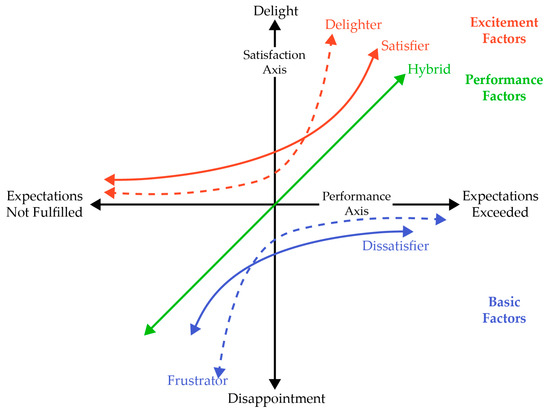 The three-factor theory of customer satisfaction, initially introduced by Kano [47] and later refined by various researchers [45,48], posits that satisfaction is not a unidimensional concept and the reverse side of dissatisfaction is not necessarily satisfaction [42]. This theory classifies attributes into three categories based on their asymmetric effects: basic, performance, and excitement factors [49,50]. Basic factors cause dissatisfaction when unmet, but their fulfillment only subtly affects satisfaction. Excitement factors, conversely, directly enhance satisfaction and lead to delight but do not typically cause dissatisfaction when lacking. Performance factors, uniquely, affect both satisfaction and dissatisfaction, as their relationship with overall satisfaction is symmetric.