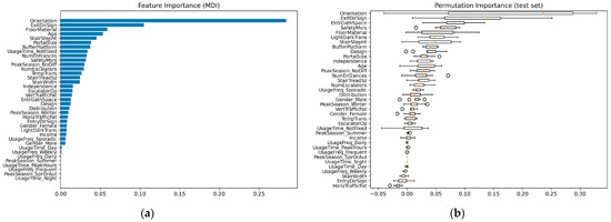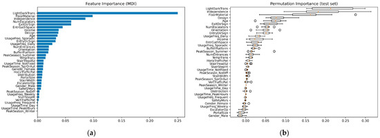 Figure 5 compares the MDI-based feature importance and the permutation importance of all the independent variables in Harbin. Certain features like orientation, exit direction signage, floor material, stair step height, portal size, and buffer platform ranked high in both MDI and permutation importance. This consistency across both metrics underscores their significant influence on passenger satisfaction, highlighting their roles as structural components of the model and their substantial impact on model accuracy. Safety measures, light–dark transitions, and design emerge as influential but in different ways across the two plots. Safety measures command high permutation importance, indicating a significant impact on model prediction when its values are altered, suggesting that passenger satisfaction is sensitive to changes in perceived safety. However, its lower MDI ranking may imply that safety, as a singular feature, does not heavily influence the model’s structure but interacts with other features to affect satisfaction. Design is more prominent in the MDI plot, suggesting it has significant contribution to the prediction power of the model. Its relatively lower but still notable permutation importance signifies that while it contributes to predictive accuracy, its impact is not as pronounced when isolated. Light–dark transitions, with a higher ranking in the permutation importance plot, points to the feature’s impact on the model’s accuracy, potentially reflecting passengers’ sensitivity to lighting transitions within the transit environment. Demographic variables present a varied picture. While age and the “no difference” subcategory of peak subway usage season demonstrate high relative importance, suggesting certain demographic factors can significantly influence satisfaction, most demographic variables like gender, usage time, and usage frequency exhibit low relative importance.