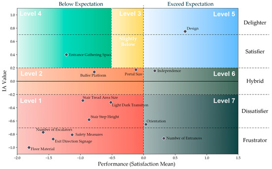 In accordance with the classification thresholds established in prior research [16,17], attributes are categorized based on their IA values into distinct groups: Frustrators are those with an IA value less than −0.7. Dissatisfiers are defined by IA values ranging from −0.7 (inclusive) to just below −0.2. Hybrid attributes have IA values that fall between −0.2 and 0.2, inclusive. Satisfiers are characterized by IA values greater than 0.2 but equal to or less than 0.7. Finally, attributes are considered delighters if their IA value is greater than 0.7.