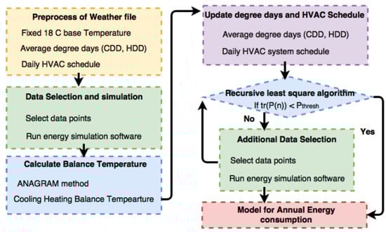 - The modified ANAGRAM method is used to shift the diagonal linear regression models to the origin based on daily average degree days to separately predict heating, cooling, and fan energy consumption;