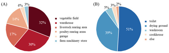 There are five main functions of rural house compounds in the severe cold regions of Northeast China, namely, the production function, living function, leisure function, vegetation greening function, and protection function [17]. These can be defined as follows: Production function: breeding, planting, storage of food and agricultural tools, parking of farm machinery and vehicles, etc., with the relative functional components of breeding sheds, vegetable plots, barns, storage of farm machinery, garages, etc. [18]. Living function: including accommodation, food, drying, washing, toilets, etc., with the relative functional components of housing, restrooms, etc. [19,20]. Leisure function, including playing cards, is the behavior of the more random, non-fixed available elements [21,22]. Greening vegetation: in addition to the courtyard of crops and economic equipment, the square of the residential compound, greening vegetation, and protective functions [23,24]. There is no fixed functional element. Protective function: that is, the courtyard enclosure is the enclosure component that separates the public space from the private courtyard so that the entire square becomes an enclosed personal space. Its height and material vary [11,25]. As shown in Figure 1, according to the research data, in the production function, the courtyard is used for vegetable gardens and warehouses in the highest proportions, accounting for 32 percent and 30 percent, respectively, and livestock and poultry farming, with 17 percent and 14 percent, respectively. In the living function, toilets have the highest proportion, of 51 percent, followed by drying, which accounts for 39 percent.