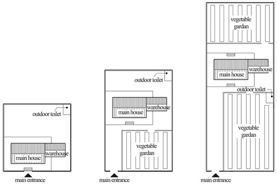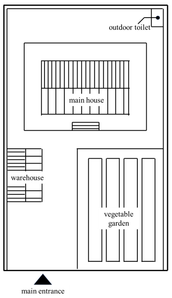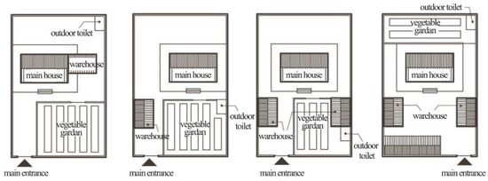 The location of its components determines the shape of the yard. According to the location of the main house, the courtyard can be divided into three types of yards: front yard, back yard, and front and back yard. According to the percentage of each element above and the research data, the layout form of the courtyard is mainly determined by the location of living quarters, barns, vegetable gardens, and dry toilets. Considering the influence of hygiene and odor, the dry latrine is usually placed separately in the downwind direction perpendicular to the prevailing wind direction, i.e., the positional relationship between the main house and the barn is as follows: the main house and the barn are arranged in parallel in the shape of a zig-zag, and the main house is arranged perpendicularly in the form of a zig-zag. The main buildings in the courtyard include the main house, compartments, and barns, and according to the number of buildings and the degree of enclosure, the courtyard can be classified into horizontal, “L,” “U,” and square, as shown in Figure 3. The horizontal courtyard consists of a main house and 1~2 compartments (or barns), and the compartments (or barns) are separated from the main house. The L-shape compound consists of a main house and a barn, both arranged vertically in an L-shape; the U-shape compound consists of a main house and two barns arranged vertically in a U-shape on both sides of the main house. The square-type mix consists of one main house and two barns arranged vertically in a “U” shape on either side of the main house.
