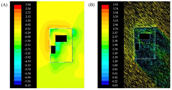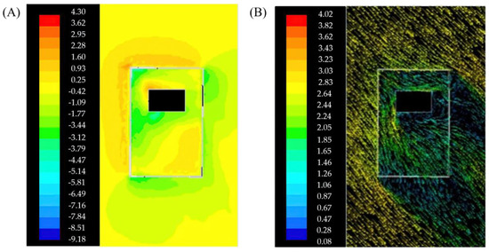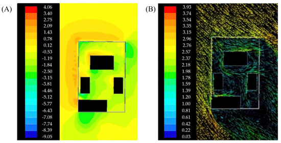 Figure 5A,B show the wind speed and wind pressure distribution diagrams of the courtyard with a horizontal layout, respectively. The wind speed ratio is 1.04. The high-value area for wind speed is on the windward side between the main house and the fence. The wind shadow area is mainly on the leeward side of the main house, with a wind speed ratio of 0.17, and the site is approximately three-quarters of the total building area. A corner wind is formed at the southwest corner of the main house, with a high wind speed value and a wind speed ratio of 1.15. The increased weight of wind pressure is distributed on the windward side of the building, which easily causes the penetration of the cold wind. The airtightness and the thermal insulation design should be strengthened for the windows and doors on the windward side of the main house [43].