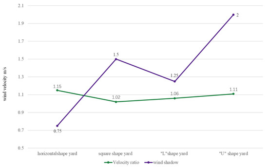 As shown in Figure 9, the wind environment is ranked according to the maximum wind speed ratio and the area of the wind shadow area as follows: square − type layout > “L” − shape layout > “U” − shape layout > horizontal − type layout.