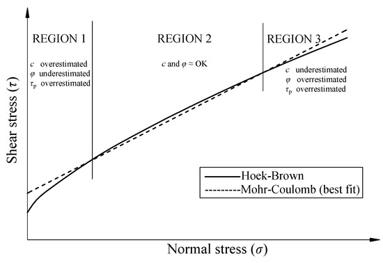 Due to its nonlinearity, the Generalized Hoek–Brown failure criterion is not convenient for direct application on slope stability analysis. Consequently, the equivalent Mohr–Coulomb parameters method was proposed by Hoek et al. [2]. By curve fitting to apply the Hoek–Brown failure criterion on slope stability analysis, as shown in Figure 2, it is seen that the straight equivalent Mohr–Coulomb envelope cannot fit the Hoek–Brown curve entirely and that the stress space is divided into three regions. The shear strength parameters are considered approximately equal to the Generalized Hoek–Brown failure criterion in Region 2.