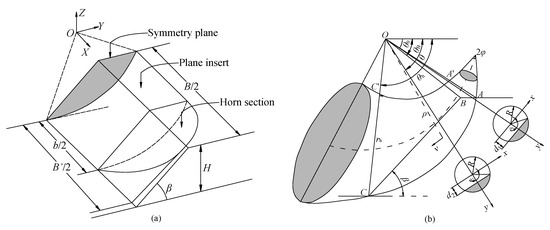 The three-dimensional (3D) failure mechanism of slope in the framework of the upper bound theorem of limit analysis is illustrated in Figure 3. Figure 3a illustrates half of the failure mechanism of a 3D slope, which comprises the 3D horn section (Figure 3b) and the insert plane. The 3D horn failure mechanism illustrated in Figure 3b has the boundary of two logarithmic spiral curves and , of which AC is also the failure surface of slope. The initial and terminate rotating angle are and , respectively. From the geometrical relationship in Figure 3, the factor of safety (FoS) solution of a 3D slope is determined by four variables: , , the ratio , and , as illustrated in Figure 3. A detailed description about the 3D failure mechanism can be found in the reports of Michalowski [21] and Xu and Yang [8].