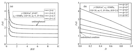 Effects of rock mass disturbance on stability of slope in Hoek–Brown media and (a) B/H = 0~10 with different D; (b) D = 0~1.0 with different β.