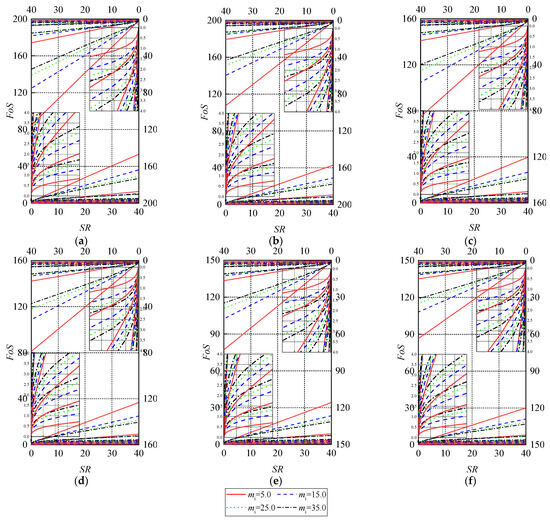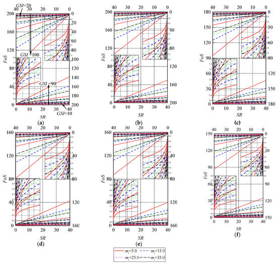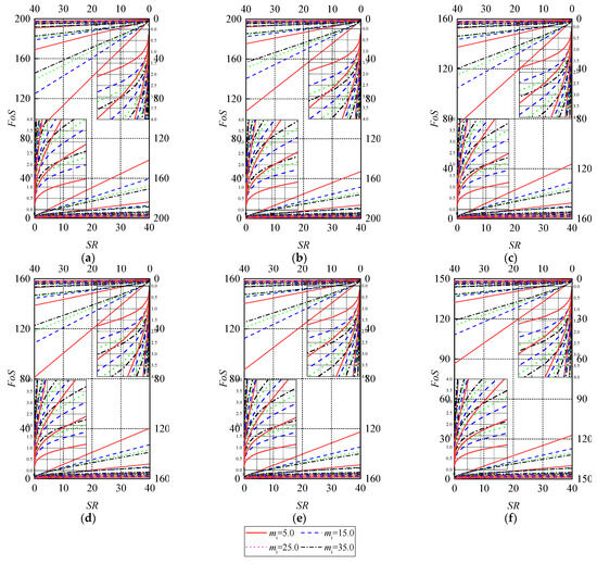 Stability charts of slope in Hoek–Brown media with D = 0 (undisturbed) and (a) B/H = 0.7; (b) B/H = 1.0; (c) B/H = 1.2; (d) B/H = 1.5; (e) B/H = 2.0; (f) B/H = 5.0.