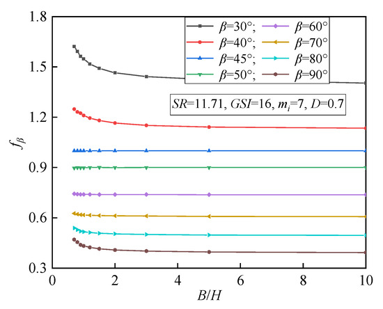 It is shown in Table 3 and Figure 9 that, for slopes within the range of 45° to 60°, the slope angle weight factor fβ is barely influenced by B/H. However, with regard to slopes within the range of 30° ≤ β < 45° and 60° < β ≤ 90°, there is a significant influence of B/H on fβ. It is also seen that the when 30° ≤ β < 45° and 60° < β ≤ 90°, the ratio fβ_3D/fβ varies with B/H significantly. In other words, it is necessary to take into account B/H on the estimation of fβ_3D. As a result, the curve-fitting strategy is employed to determine the estimation equations to estimate the slope angle weighting factor fβ_3D considering the influence of B/H, as listed in Table 4.