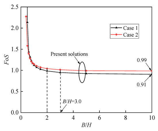 It can be seen from Table 5 that the present 3D solutions are in good agreement with the previous FoS solutions. It should be noted that the previous FoS solutions were obtained under 2D plane strain, and it is clear from Figure 10 that ratio B/H has a significant impact on FoS solutions. When the width of the failure block is greater than slope height (), FoS solutions under 2D plane strain will be adequate; however, for conditions where the width of slope is limited (), a 3D stability analysis will be more appropriate and advanced to estimate the FoS solutions of slope.