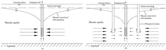 Profile view of groundwater seepage and partial pumping well in phreatic aquifer. (a) Without curtain. (b) With curtain.