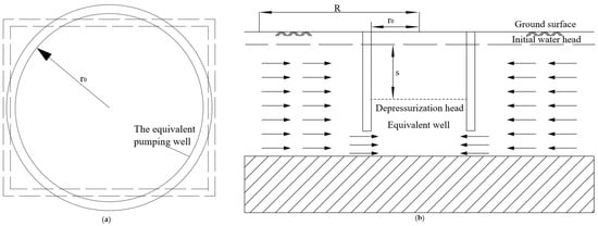 As illustrated in Figure 2a, based on the Dupuit theory of drawdown curves [39], the foundation pit with the suspended waterproof curtain can be analogously represented as a two-dimensional partial pumping well of radius r0 (the radius of the equivalent pumping well for the excavation) in the phreatic aquifer. The calculation of the drawdown in the equivalent well using the Theis formula [40] can be expressed as follows:
