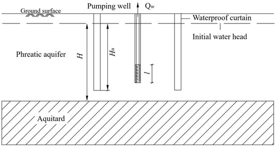 To investigate the groundwater drawdown under the coupled influence of waterproof curtain and pumping wells, the analysis is conducted under standard conditions, with the waterproof curtain embedding depth (Hu) set at 36 m. The length of the well screen (l) is equal to Hu, the initial groundwater table in the phreatic aquifer is 2 m, and the aquifer thickness (H) is selected as 38 m, as depicted in Figure 3.
