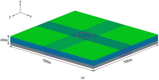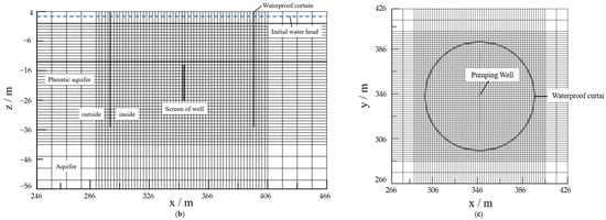 In accordance with the requirements, considering an aquifer thickness of 38 m, the calculated drawdown influence radius is 259 m. Consequently, as illustrated in Figure 4a, the equivalent circular well radius (r0) of the model is set to 54 m, and the finite difference model extended 260 m in all directions. This resulted in the creation of a three-dimensional grid with dimensions measuring 700 m in length and width, and 60 m extending in the z-axis direction. The model is divided into 42 layers, 4 for aquitard and 38 for phreatic aquifer, with 88 columns of values in 96 rows horizontally. The grid is fine in the excavation area of the pit. The grid is coarse at the edge of the excavation.