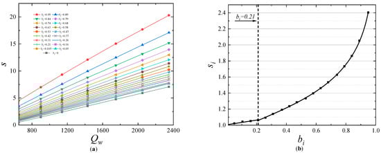 Variation results in the standard state. (a) Qw-s curves with different bi. (b) Normalized curve.