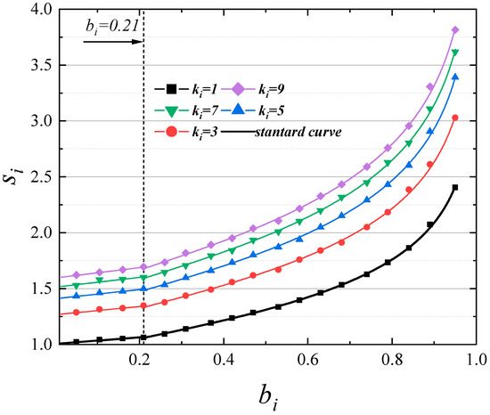 Figure 6 indicates that as the ki value increases, the bi-si curve does not coincide with the standard curve, providing evidence that ki does have an impact on the blocking effect of the curtain. The value of ki varies from 3 to 9, and with increasing values of ki, the curve deviation becomes more pronounced. The ratio of the numerical solution for the drawdown to the analytical solution increases, suggesting that the permeability anisotropy enhances the blocking effect of the waterproof curtain. To extend Equation (5) to different forms of permeability anisotropy, a correction coefficient function denoted as α is introduced. Its expression is given in Equation (6):