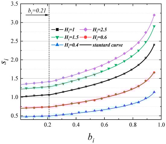 While maintaining the ratio of the insertion depth of the waterproof curtain (bi) constant, a reduction in the thickness of the aquifer (H) leads to lower piezometric head values in the surrounding area. This results in a decrease in the seepage field area and the vertical hydraulic recharge, ultimately reducing the required dewatering discharge to control drawdown. Changes in the thickness of the aquifer also affect the seepage field distribution, leading to a nonlinear relationship between drawdown and aquifer thickness. Introducing the non-standard aquifer thickness coefficient, by adjusting Hi (Hi = H/38), the impact of non-standard aquifer thickness can be calculated on the bi-si curve, as illustrated in Figure 7.