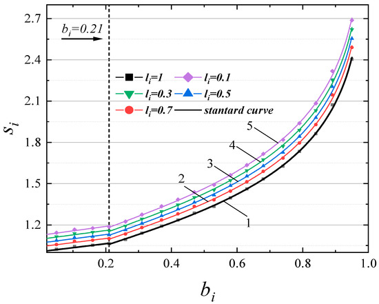 Figure 8 demonstrates that the blocking effect of the curtain varies with different values of li. While the shape of the bi-si curve remains consistent across different li values, a reduction in the length of the well screen leads to a vertical upward shift in the curve. This shift provides evidence that the well screen length enhances the blocking effect. Similar to the method used for solving aquifer thickness coefficient, a coefficient of variation, γ, for non-standard well screen lengths is determined, and its expression is as follows: