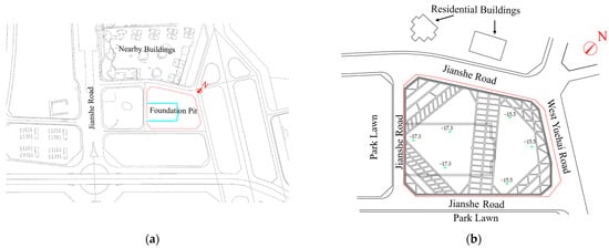 The layout of foundation pit. (a) Environment around the pit. (b) Plan view of the foundation pit.