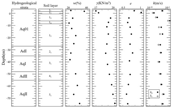 Illustration of geotechnical profile and soil hydraulic conductivity. Note: ω = water content, γ = unit weight, e = void ratio, kh = horizontal permeability coefficient, and kv = vertical permeability coefficient.