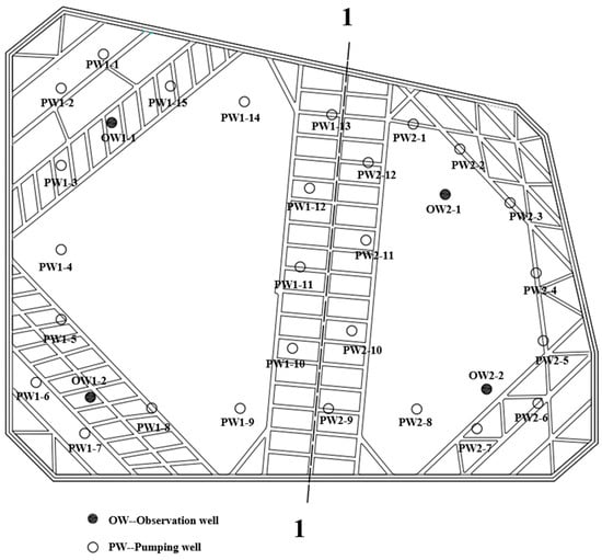 The distribution of pumping wells in this project is divided into two parts with 1-1 section, numbered DW1-n(n=1–15) and DW2-n(n=1–12). The length of the pumping wells is 23.0–24.8 m, the effective length of the filter pipe is 5–12 m, and the spacing of the precipitation wells is about 14.8–17.5 m. At the same time, the observation wells are set up around the pumping wells. The location of the pumping wells and the observation wells is shown in Figure 11.