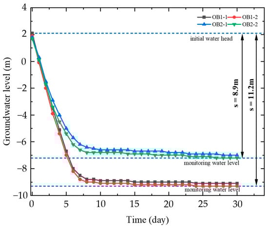 The pumping capacity of the pumping wells DW1-n(n=1,2,3,5,6,7) on the southwest side and DW2-n(n=1,2,3,6,7,8) on the northeast side of the pit are used as reference, with the pumping capacities of the reference pumping wells on the southwest side ranging from 150 to 165 m3/d, and the pumping capacities of the pumping wells on the northeast side ranging from 160 to 168 m3/d. At the same time, based on the observation data from the observation wells (OW1-1, OW1-2, OW2-1, and OW2-2), the groundwater level changes in the pit are reflected. When the fluctuation of water level in the observation wells is less than 2–3 m, it is considered to reach a stable groundwater level [48]. The observation process is accumulated for 30 days. Figure 12 shows the groundwater level observation data in the observation wells.