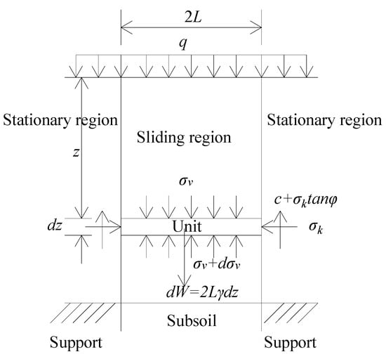 As shown in Figure 5, the vertical pressure along the horizontal axis is assumed to be uniformly distributed, and the sliding plates are assumed to be vertical planes. The soil between the supports is divided into units, the thickness of which can be considered infinitesimal, and the thickness of a unit can be represented by dz. The weight of the unit is defined as 2Lγdz, and the weight of the overlying soil is 2Lγz, where 2L is the width of the sliding plates, and γ is the unit weight of the soil. Assuming that the vertical stress at any depth into the soil is σv, the vertical stress below the unit will be σv + dσv. If there is a slippage or a trend of slippage, a shearing resistance will occur between the soil and the support structure, defined as c + σktanφ, where c is the cohesion of the soil and σk is the horizontal stress acting on the soil. Clearly, the numbers of the increased vertical stress at the support structure and the decreased vertical stress at the yielding soil are both equal to c + σktanφ. In other words, there is a stress-transfer phenomenon between the yielding soil and the support structure, whose number is equal to c + σktanφ.