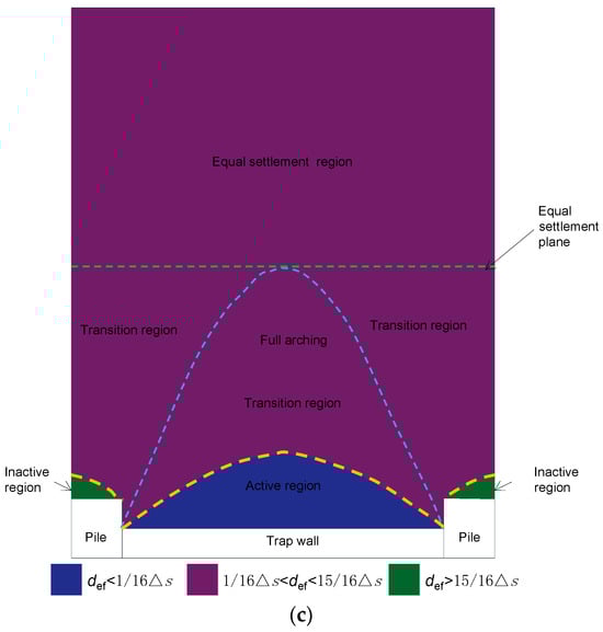 And, Lai [,,] also divided the soil arch into three shapes: shear plane arching [,], partial arching [], and full arching []. As shown in Figure 15, the three types of arching are associated with an inactive region (def < 1/16Δs: located above the piles), an active region (def > 15/16Δs: a sliding region that is located above the trap-wall), and a transition region (1/16Δs < def < 15/16Δs: between the inactive and active regions). And, def is the displacements of embankment fill, and Δs is the pile–subsoil relative displacement. However, compared with shear plane arching and partial arching, there is an equal settlement region in the full arching case. Evidently, there is no differential settlement in the equal settlement region. Thus, the height of the bottom of the equal settlement region is defined as the critical height.