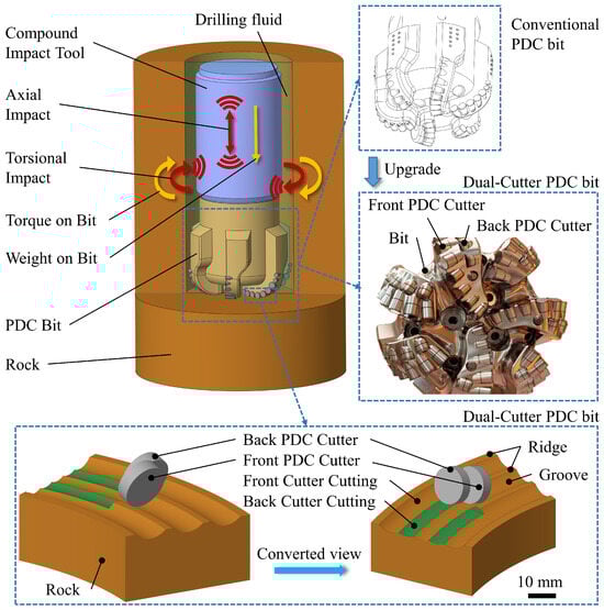 Comparison between conventional PDC bit and dual-cutter PDC bit and the working schematic.