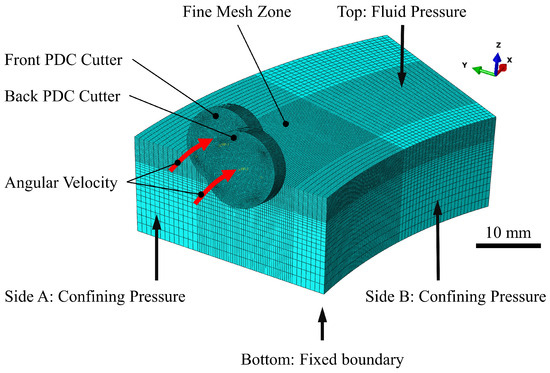 The interaction between the drill bit and rock is characterized as a dynamic system of surfaces and nodes that dynamically update the contact surface upon rock fracturing, thereby simulating the removal of fragmented rock layers beneath the bit and exposing fresh surfaces during drilling. A fixed boundary is established at the base of the rock model, where pressure is applied to confine the cylinder surface while fluid pressure is exerted on the upper portion of the rock. The back-rake angle of the cutter is , the cutting depth of the cutter is fixed, and the cutter rotates at an angular speed of rad/s around the center of rotation, with a front cutter rotation radius of mm and a back cutter rotation radius of mm to mm. The illustration of Figure 4 demonstrates the configuration of bit model loading and the establishment of boundary conditions. The physical and mechanical parameters of the rock (granite) [33,34] are shown in Table 1. The confining pressure and fluid pressure are MPa, and MPa [35]. All the bit control parameters are shown in Table 2.