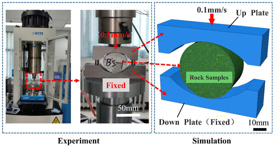 The validity of the constitutive rock model is confirmed by comparing the Brazilian splitting simulation results with experimental findings conducted by [36]. In their experiment, a GCTS (Geotechnical Consulting & Testing Systems) rock mechanics testing machine was utilized to perform a Brazilian splitting test on rock specimens measuring mm in diameter, and mm in thickness. The lower pressing plate of the testing apparatus remained stationary, while the upper pressing plate gradually descended at a rate of 0.1 mm/s to apply load onto the rock sample until it incurred damage. Similarly, the simulation model utilized rock samples measuring mm in diameter, and 25 mm in thickness. The physical and mechanical characteristics of the rocks employed in the simulation model can be found in Table 1. The experimental setup consisted of two upper and lower pressure plates, with the rock samples positioned along the XY direction for diameter measurement and Z direction for thickness measurement. When allowing translational freedom in the Y direction, the upper plate remained fixed in all other directions. To replicate a Brazilian splitting experiment, a gradual displacement load of 5 mm was applied at a rate of mm per second along the Y axis. As a matter of fact, this part has been verified in our previous work [37]. Figure 5 illustrates both the experimental system and simulation model used for this purpose.
