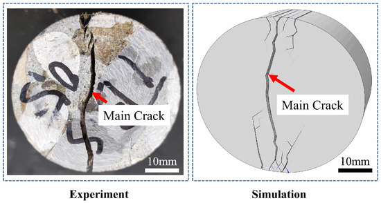According to the findings presented in Figure 6, the primary crack observed in both the simulated rock samples and Brazil splitting test is identical. Additionally, Figure 7 illustrates the stress–strain relationship. The stress–strain curve obtained from simulation aligns perfectly with that extracted from experimentation, exhibiting similar characteristics such as equivalent slope during the elastic stage, peak strength of rock failure, and subsequent strength degradation post-failure. These combined experimental and simulation results affirm that the employed rock constitutive model accurately depicts the stress–strain behavior and damage properties of rocks.