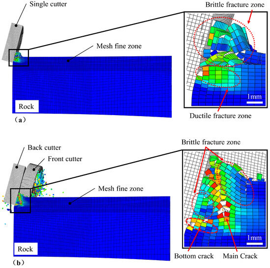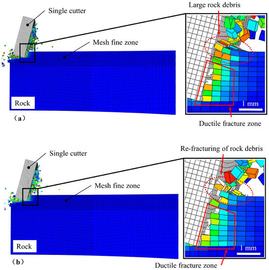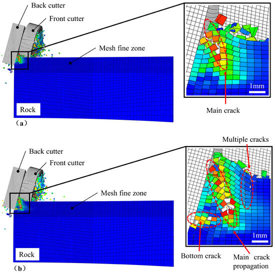 Figure 11 compares the difference between single-cutter cuts and dual-cutter cuts. In single-cutter cutting, the surface of the rock in front of the cutter is a brittle failure, and the deep rock is a plastic failure. Large fragments of rock formed by the brittle failure of the rock surface will produce repeated failures under the compression of the drill cutter. During the dual-cutter cutting process, the grooves formed by the front-cutters change the stress state of the rock surface, and residual plastic strain is also generated in the rock near the grooves. When the back cutter cuts along the spine in the middle of the two grooves, it can considerably reduce the consumption of cutting force and cutting energy, improve the energy utilization of rock breaking, and increase the efficiency of rock breaking. The shape of the crack produced by the back cutter during the dual-cutter cut also differs from that of the single-cutter cut. The difference that can be clearly observed is that a wide main crack will be formed in the direction of the cutting direction at an angle of about 60°, and there is a brittle failure area before and after the main crack. The brittle failure zone in front of the main fracture will generate multiple fractures perpendicular to the cutting direction as the bit progresses, and these fractures will spread through the rock surface to form large pieces of rock debris. The bottom of the brittle failure zone at the back of the main crack will form a bottom crack with the advance of the drill cutter, and the expansion of the bottom crack will intersect the main crack, thus forming a large piece of rock debris in the rear brittle failure zone. Compared with single-cutter cutting, two-cutter cutting can form a larger brittle failure area, and the probability of repeated breakage of cuttings is also more negligible. Thus, two-cutter cutting can improve drilling efficiency.