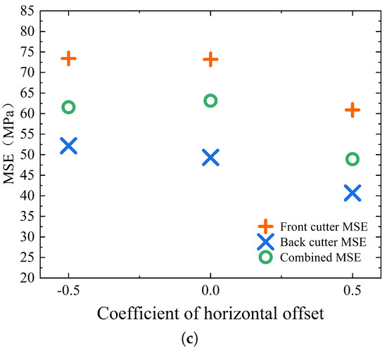 This section calculates and plots the MSE values for horizontal offset coefficients of −0.5, 0.0, and 0.5; vertical offset coefficients of 0.2, 0.3, and 0.5, respectively. It should be noted that the horizontal offset coefficient −0.5 corresponds to the outward offset distance of the back cutter to 0.5 times the drill cutter diameter, the coefficient 0.0 corresponds to the zero offset distance relative to the front cutter, and the coefficient 0.5 corresponds to the inward offset distance of the back cutter to 0.5 times the drill cutter diameter. It should be pointed out that the inward and outward offset here is relative to the front cutter. The distance between the back cutter and the rotation axis is greater than the front cutter for the outward offset, and the reverse is the inward offset. The vertical offset coefficients of 0.2, 0.3, and 0.5 indicate that the downward offset distance of the back cutter is 0.2 times, 0.3 times, and 0.5 times the depth of the front cutter.